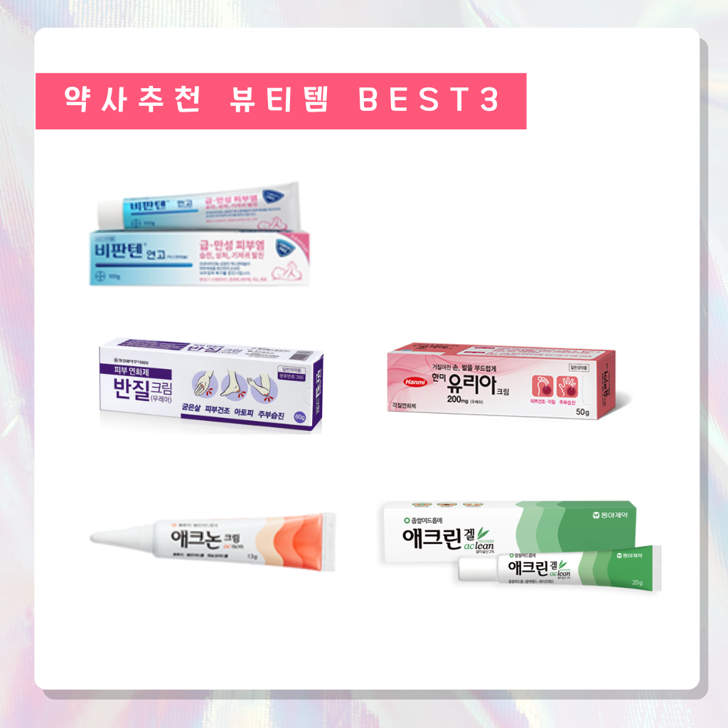 약사들이 입을 모아 추천하는 약국추천 뷰티템 BEST 3 로 비판텐연고, 유리아크림과 반질크림, 애크린겔과 애크논크림으로 정리해 보았습니다. 저렴한 가격으로 많은 효과를 볼 수 있는 제품이니 집에 상비약으로 두고 보습, 각질제거, 트러블 등의 피부고민을 해결해 볼 수 있습니다.