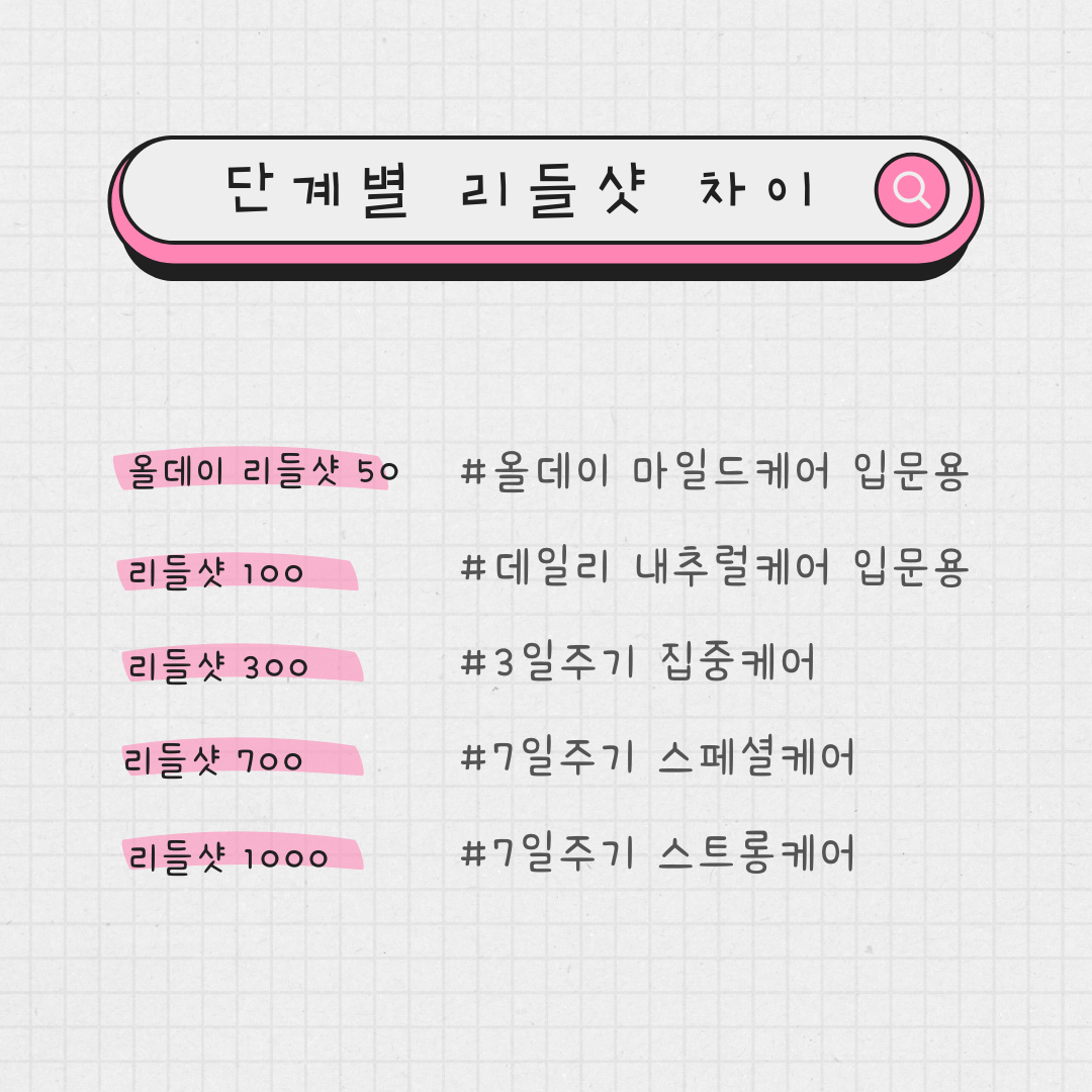 리들샷은 50,100,300,700,1000 총 5 단계로 되어 있고 높은 단계일수록 시카리들이 더 많이 함유되어 있고 100보다 300을 사용하는 게 더 피부 흡수율을 높여 주고 더 피부 깊숙이 성분이 전달되도록 도와줍니다.