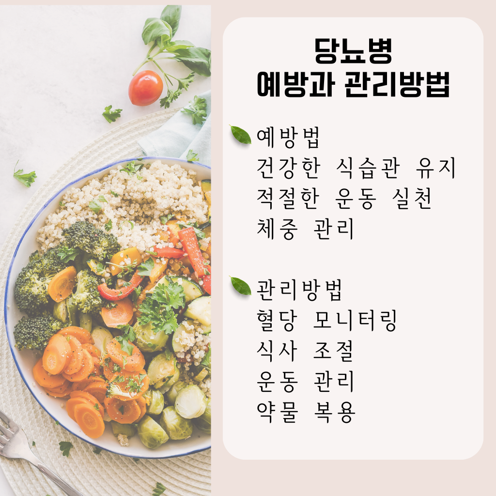 - 정량 조절 : 식사량과 탄수화물 섭취량을 조절하여 혈당을 안정시킵니다. 정기적인 식사 및 간식 섭취도 중요합니다.